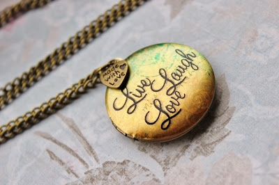 - Colar comprido com corrente ouro velho, pendente coração made with love e medalhão "Live, Laugh, Love" (3,2 cm). O medalhão abre e é possível colocar 2 fotos no interior.