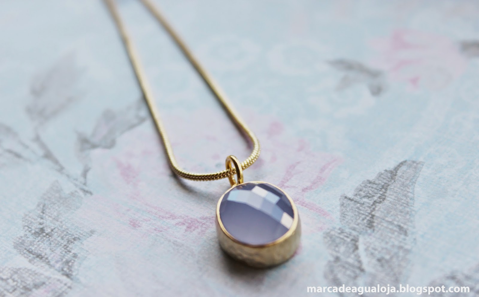- Colar curto com fecho atrás para ajustar comprimento. Corrente dourada fina e pedra preciosa em tons de lilás e cobertura a ouro.